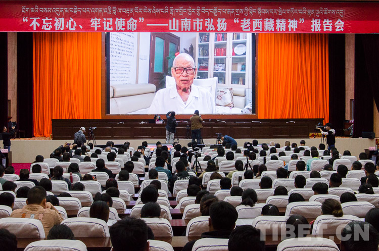 圖為報(bào)告會上,98歲高齡的西藏自治區(qū)黨委原第一書記陰法唐向活動發(fā)來祝福視頻 攝影:趙耀