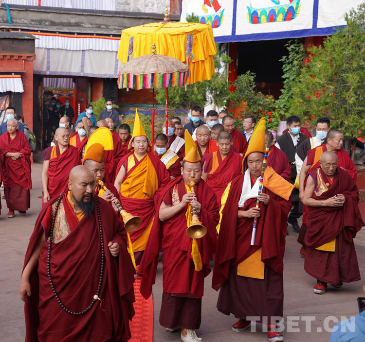 桑煙裊裊、法號齊鳴,班禪在扎什倫布寺僧人儀仗隊簇擁下緩步走進措欽大殿,邊走邊向僧俗信眾揮手致意,頷首微笑,回應(yīng)熱切期盼。