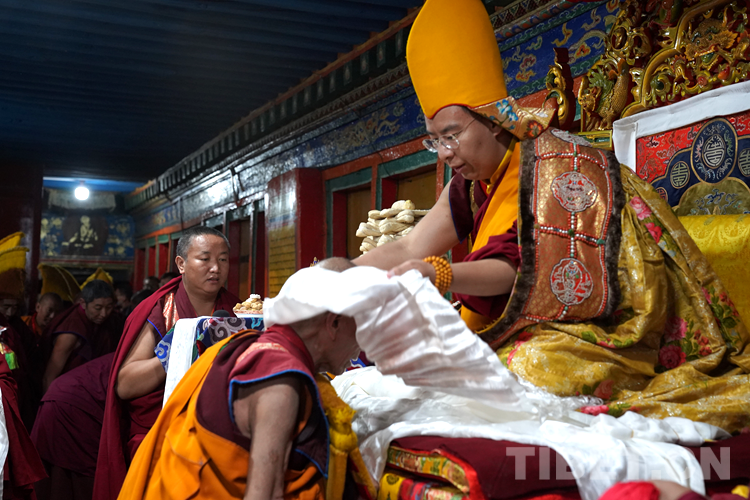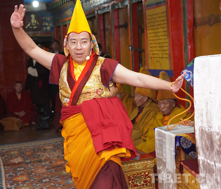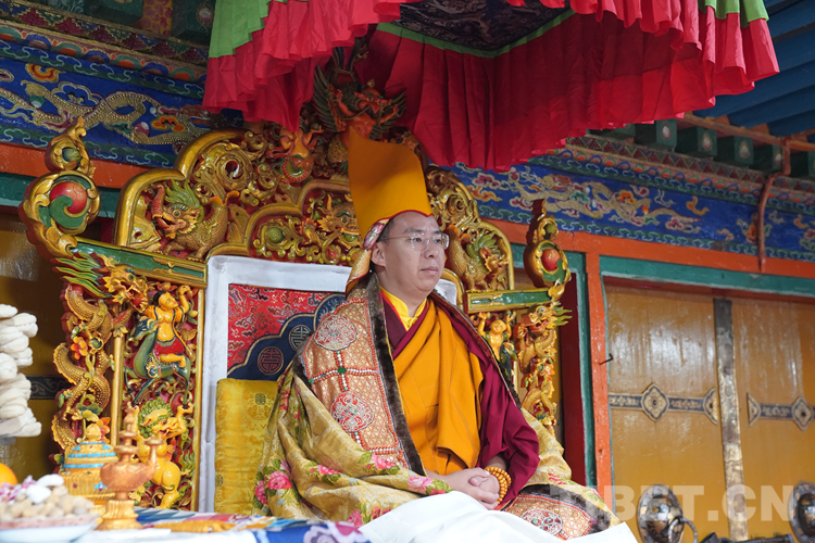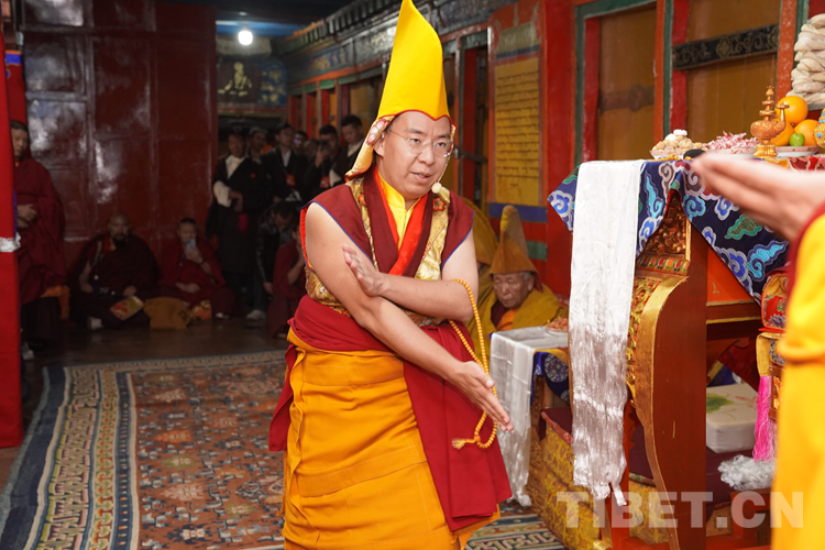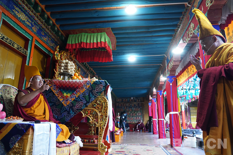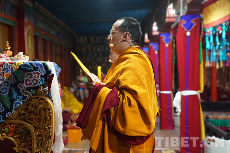 27日(藏歷9月22日),扎什倫布寺舉行祝賀班禪獲得嘎欽學位吉祥祈愿法會。班禪向在場所有僧眾摸頂賜福,并與僧眾集體誦經(jīng),回向祈福饒益眾生、法務(wù)昌隆、國泰民安、風調(diào)雨順。