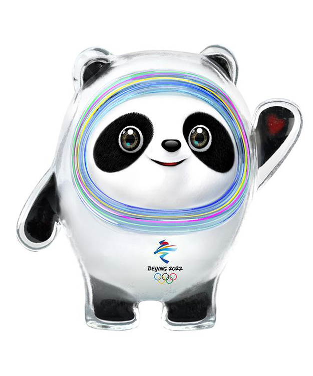 以熊貓為原型進行設計創(chuàng)作。將熊貓形象與富有超能量的冰晶外殼相結合,體現了冬季冰雪運動和現代科技特點。頭部外殼造型取自冰雪運動頭盔,裝飾彩色光環(huán),其靈感源自于北京冬奧會的國家速滑館——“冰絲帶”,流動的明亮色彩線條象征著冰雪運動的賽道和5G高科技;左手掌心的心形圖案,代表著主辦國對全世界朋友的熱情歡迎。整體形象酷似航天員,寓意創(chuàng)造非凡、探索未來,體現了追求卓越、引領時代,以及面向未來的無限可能。