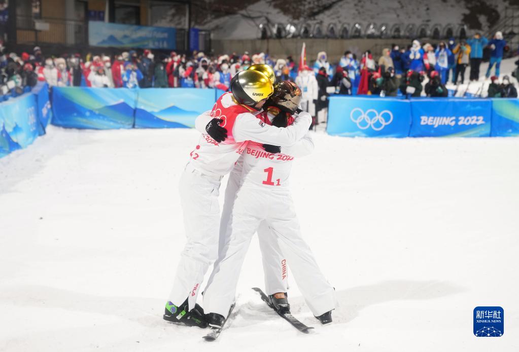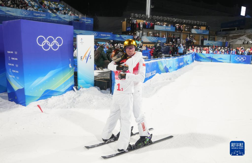 2月10日,中國隊選手徐夢桃與賈宗洋(右)賽后擁抱。新華社記者 費(fèi)茂華 攝
