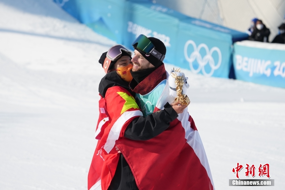 2月15日,北京2022年冬奧會單板滑雪男子大跳臺決賽在首鋼滑雪大跳臺舉行,中國選手蘇翊鳴獲得冠軍,挪威選手蒙斯·勒伊斯韋蘭獲得亞軍,加拿大選手馬克斯·帕羅特獲得季軍。圖為蘇翊鳴(左)與馬克斯·帕羅特擁抱。 中新社記者 毛建軍 攝