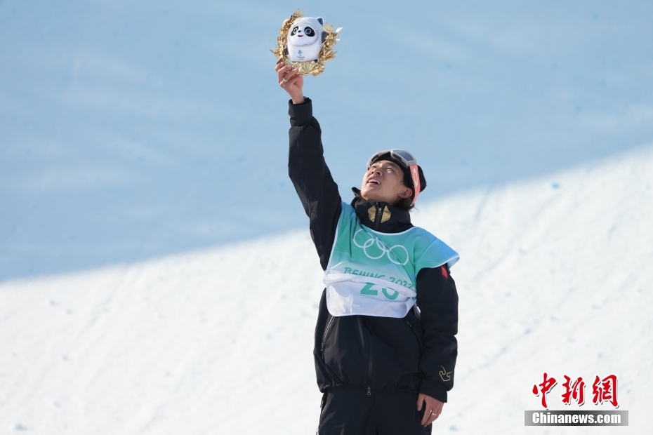 2月15日,北京2022年冬奧會單板滑雪男子大跳臺決賽在首鋼滑雪大跳臺舉行,中國選手蘇翊鳴獲得冠軍。圖為蘇翊鳴在頒發(fā)紀念品儀式上。 中新社記者 毛建軍 攝
