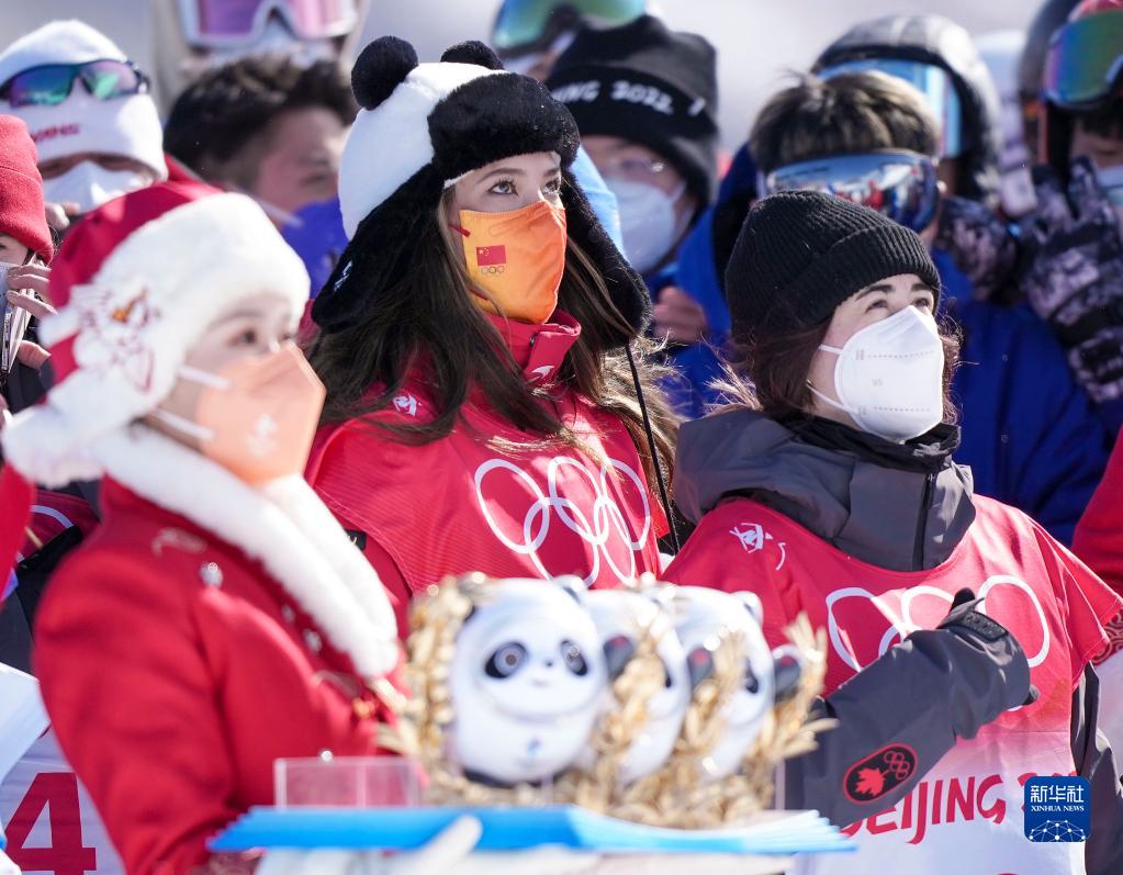 2月18日,獲得冠軍的中國隊選手谷愛凌(中)、獲得亞軍的加拿大選手凱茜·夏普(左)和獲得季軍的加拿大選手蕾切爾·卡克在比賽后慶祝。新華社記者 王昊飛 攝