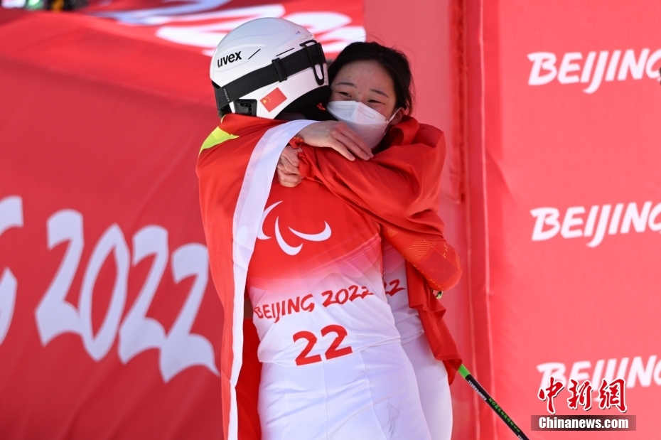 3月6日,中國選手張夢秋賽后慶祝勝利。當(dāng)日,北京2022年冬殘奧會殘奧高山滑雪女子超級大回轉(zhuǎn) - 站姿決賽在延慶國家高山滑雪中心舉行,中國選手張夢秋奪得金牌。 中新社記者 劉冉陽 攝