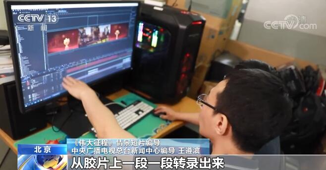 《偉大征程》情景短片編導 中央廣播電視總臺新聞中心編導 王遵濱:我們總臺的4K和8K的實驗室做了高質(zhì)量修復(fù),有一些畫面素材因為它存在一些物理性的這種損傷,我們就聯(lián)系了新影廠。然后他們根據(jù)我們成片里用到的鏡頭,選取他們庫里相應(yīng)的內(nèi)容,從膠片上一段一段轉(zhuǎn)錄出來,我們再進行節(jié)目的重新制作。