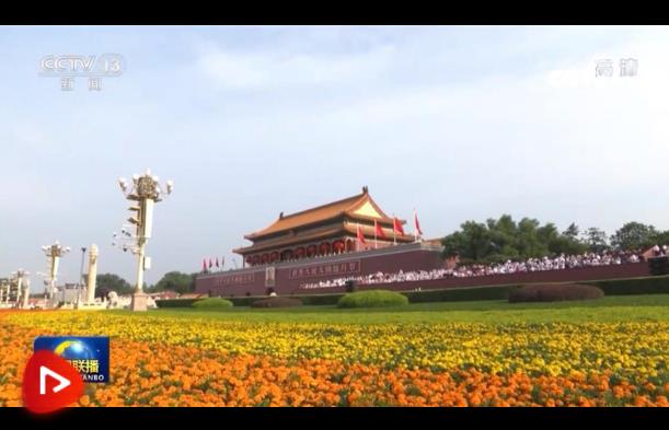 8點(diǎn)整,慶祝大會開始。100響禮炮響徹云霄?,F(xiàn)場升國旗、奏唱國歌。此后,各民主黨派、工商聯(lián)和無黨派人士聯(lián)合致賀詞,由共青團(tuán)員和少先隊(duì)員組成的千人方陣集體致獻(xiàn)詞。