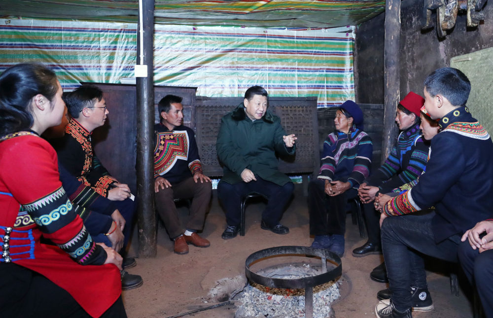 2018年2月11日,習(xí)近平在四川涼山彝族自治州昭覺(jué)縣三岔河鄉(xiāng)三河村節(jié)列俄阿木家中同村民代表、駐村扶貧工作隊(duì)員圍坐火塘邊,共謀精準(zhǔn)脫貧之策。