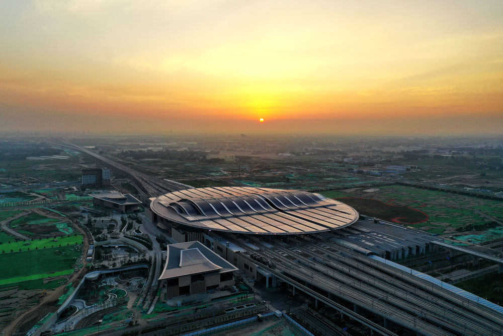 2021年7月1日在河北雄安新區(qū)京雄城際鐵路雄安站拍攝的日出(無(wú)人機(jī)照片)。