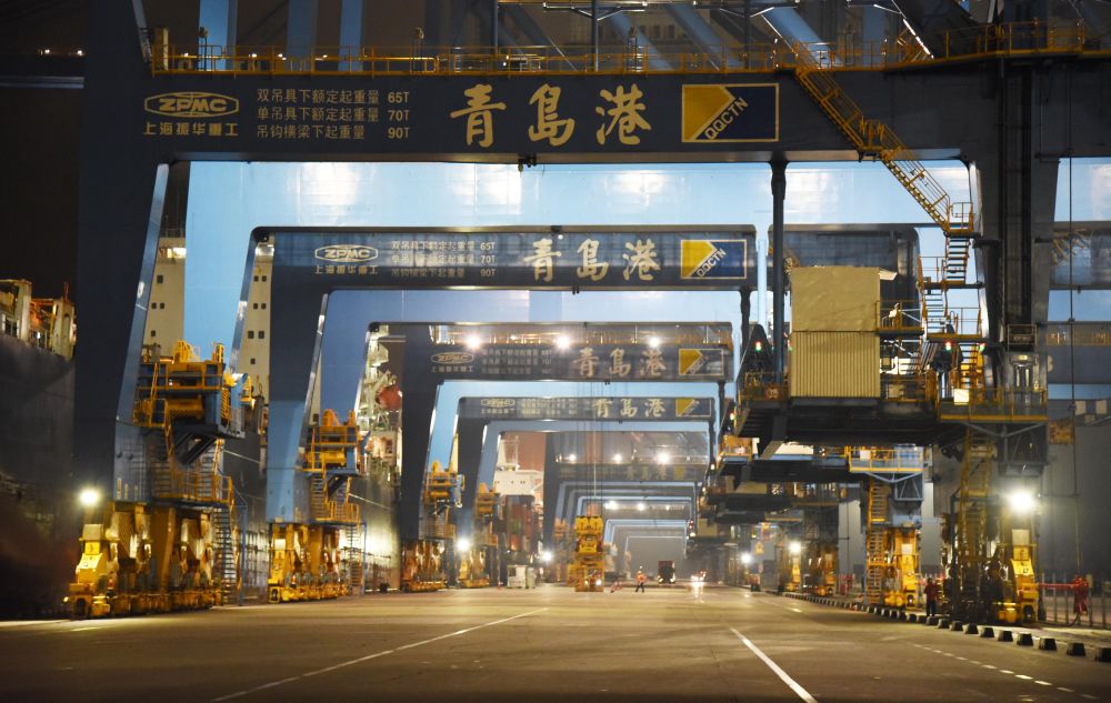 2021年7月1日凌晨拍攝的山東港口青島港全自動(dòng)化集裝箱碼頭。