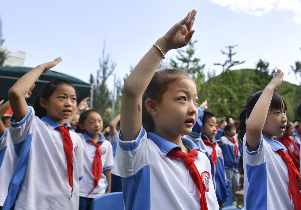 2021年7月1日,在陜西延安楊家?guī)X福州希望小學(xué),學(xué)生在收看慶祝中國(guó)共產(chǎn)黨成立100周年大會(huì)時(shí)唱國(guó)歌。