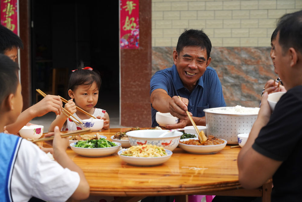 2021年7月1日,江西省瑞金市葉坪鎮(zhèn)禾倉(cāng)村村民曾得濤(中)和家人一起吃早飯。