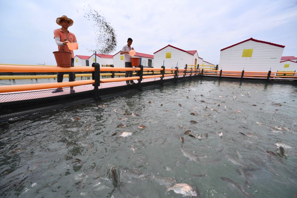 2021年7月1日,福建省寧德市霞浦縣溪南鎮(zhèn)七星海域轉(zhuǎn)型升級(jí)的深水網(wǎng)箱養(yǎng)殖區(qū)工人在喂魚(yú)。
