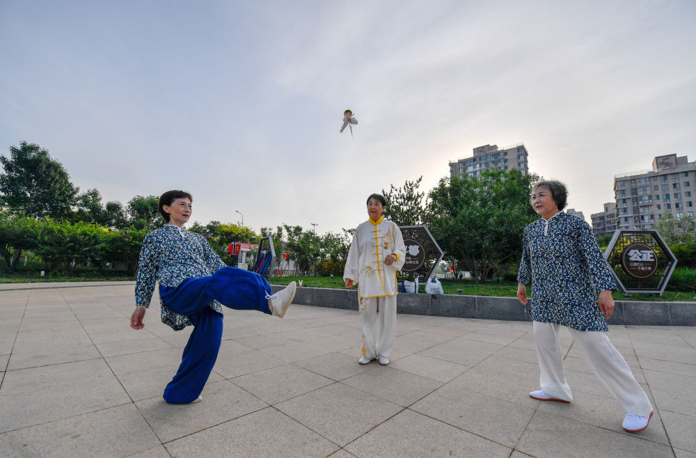 2021年7月1日,市民在天津市南翠屏公園內(nèi)踢毽健身。