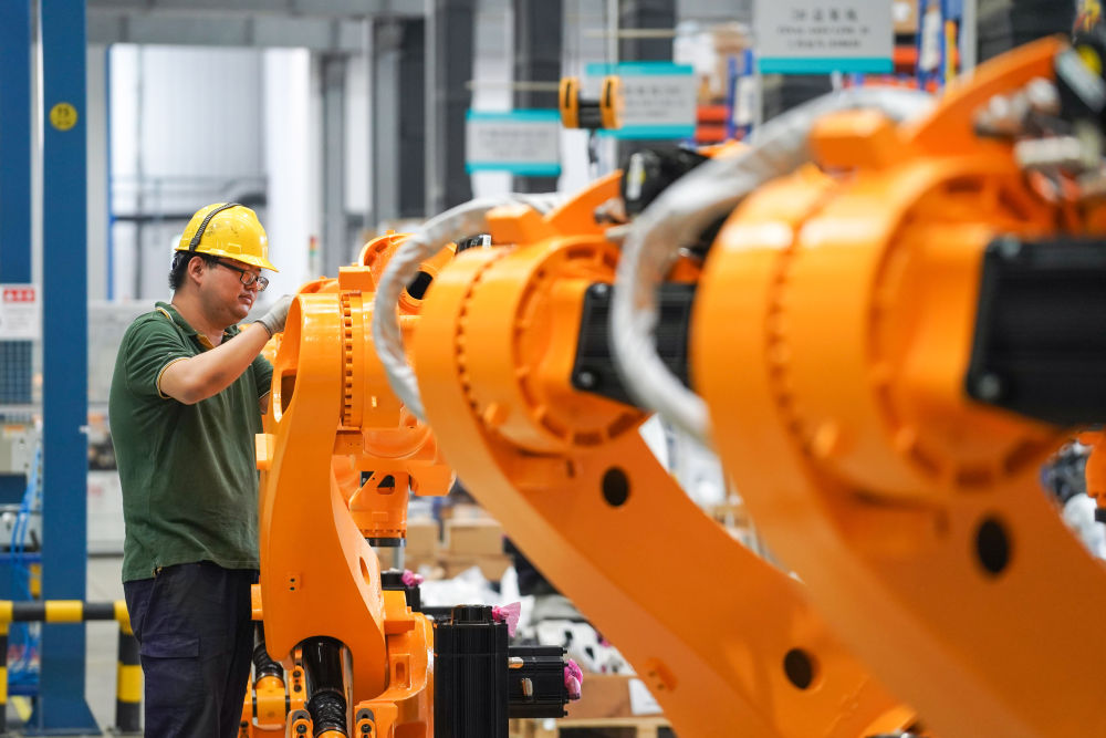2021年7月1日,在位于南京市江寧區(qū)的南京埃斯頓自動(dòng)化股份有限公司工業(yè)機(jī)器人生產(chǎn)車(chē)間,工作人員對(duì)組裝好的工業(yè)機(jī)器人進(jìn)行調(diào)試。