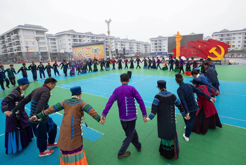 2021年7月1日,在四川省布拖縣易地扶貧搬遷縣城集中安置點(diǎn)(依撒社區(qū)),彝族群眾在廣場(chǎng)上跳彝族達(dá)體舞。