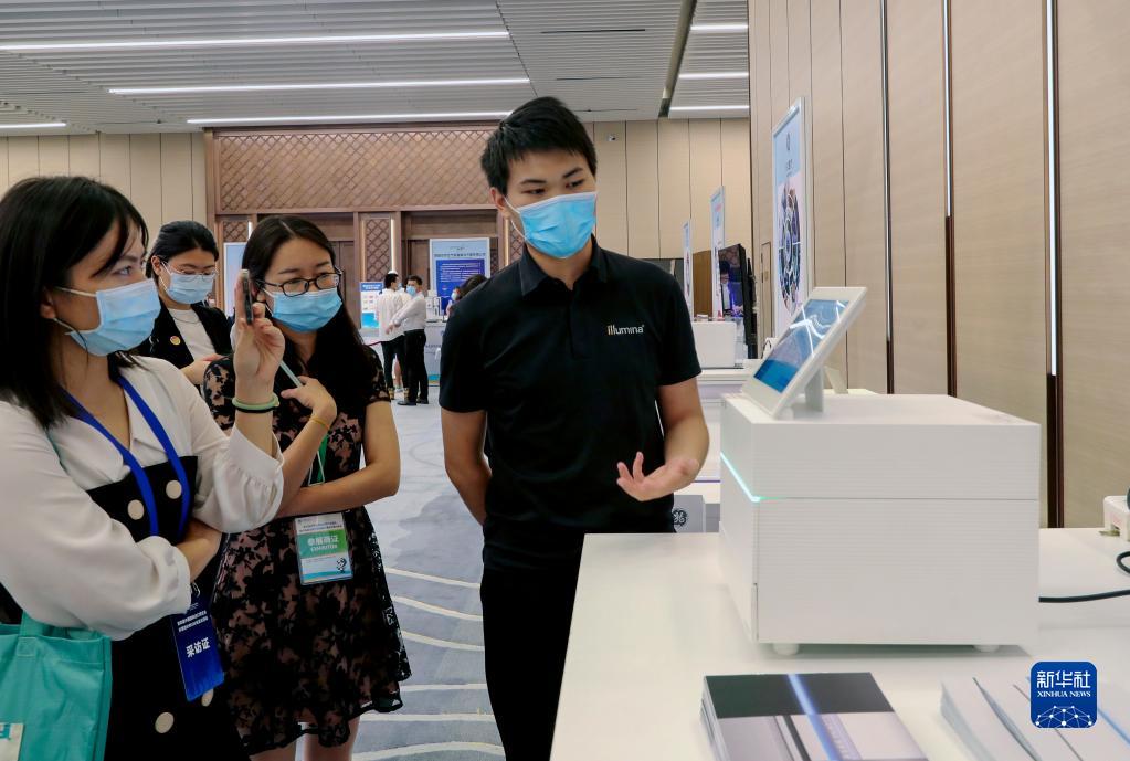 在國家會展中心(上海),第四屆進(jìn)博會食品及農(nóng)產(chǎn)品展區(qū)、醫(yī)療器械及醫(yī)藥保健展區(qū)展前供需對接會的工作人員在介紹一臺測序儀展品(7月26日攝)。新華社記者 方喆 攝