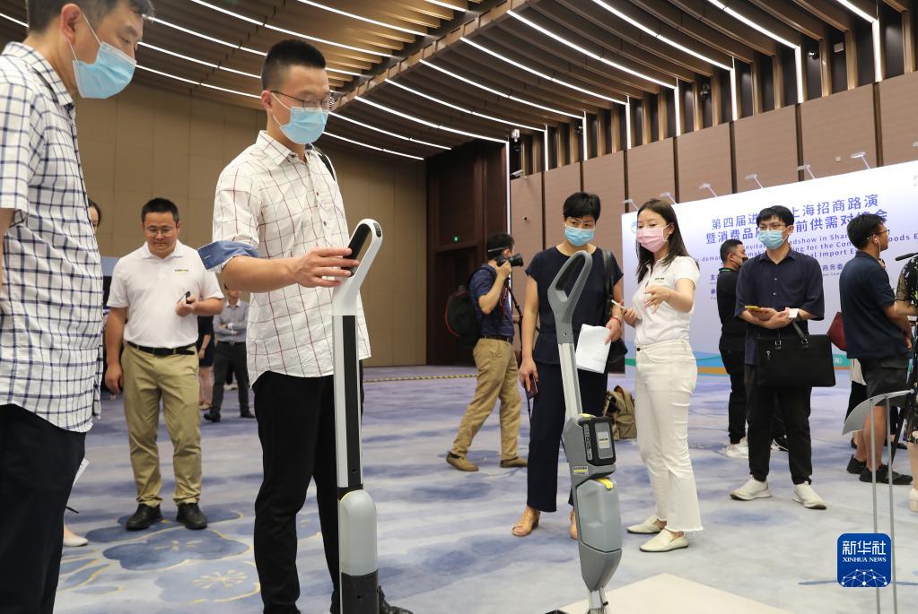 第四屆進(jìn)博會上海招商路演暨消費(fèi)品展區(qū)展前供需對接會在國家會展中心(上海)舉行,一家德國企業(yè)在對接會現(xiàn)場展出的清潔產(chǎn)品吸引參會嘉賓觀看(7月15日攝)。新華社記者 方喆 攝