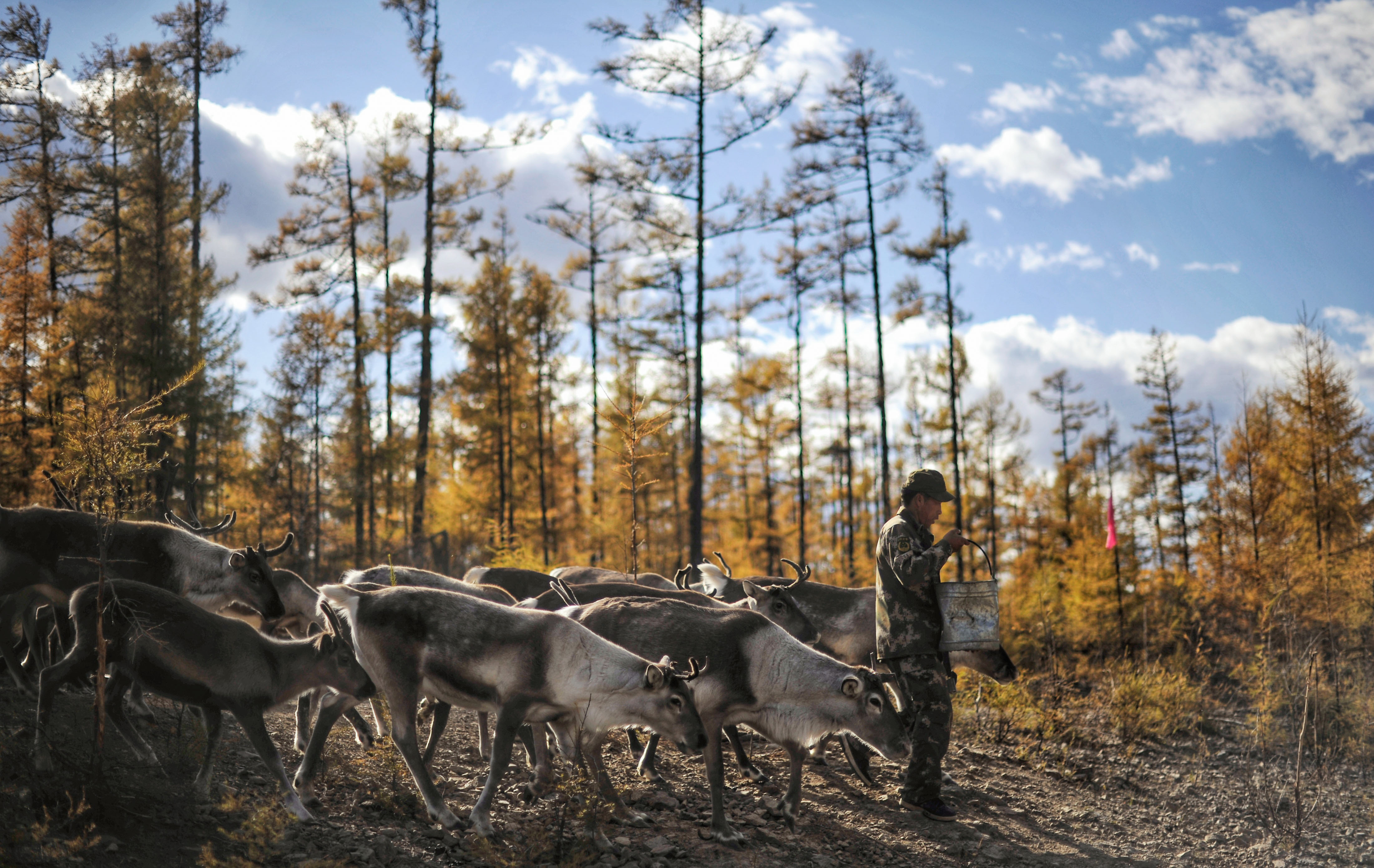 內(nèi)蒙古大興安嶺根河林業(yè)局約安里林場(chǎng),林場(chǎng)職工張國(guó)華為馴鹿補(bǔ)充飼料。