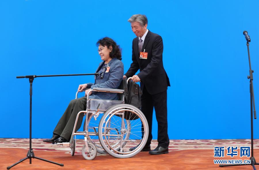 3月4日,全國政協(xié)十三屆四次會議第一場“委員通道”采訪活動在北京人民大會堂新聞發(fā)布廳舉行。這是采訪活動結束后,全國政協(xié)委員范迪安推著全國政協(xié)委員張海迪離開會場。新華社記者 李賀 攝