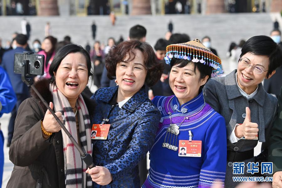 3月7日,全國政協(xié)十三屆四次會議在北京人民大會堂舉行第二次全體會議。這是會議結(jié)束后,政協(xié)委員夏寧、區(qū)捷、韋震玲、楊靜華(從左至右)在人民大會堂外合影。新華社記者 李鑫 攝