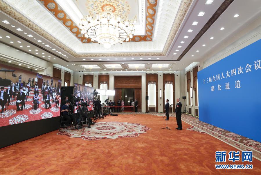 3月8日,第十三屆全國人民代表大會第四次會議舉行第二場“部長通道”采訪活動。這是商務部部長王文濤(右)通過網絡視頻方式接受采訪。