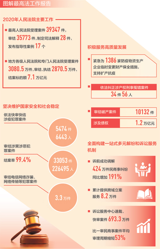 3月8日,十三屆全國(guó)人大四次會(huì)議聽(tīng)取和審議了最高人民法院院長(zhǎng)周強(qiáng)所作的最高人民法院工作報(bào)告。代表委員表示,過(guò)去一年,人民法院緊緊圍繞“努力讓人民群眾在每一個(gè)司法案件中感受到公平正義”目標(biāo),堅(jiān)持服務(wù)大局、司法為民、公正司法,忠實(shí)履行憲法法律賦予的職責(zé),依法服務(wù)統(tǒng)籌推進(jìn)疫情防控和經(jīng)濟(jì)社會(huì)發(fā)展,各項(xiàng)工作取得新成效。