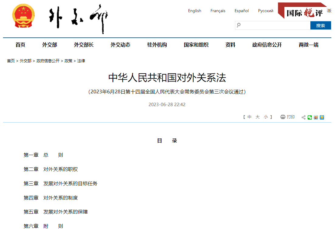 從7月1日起,《中華人民共和國對(duì)外關(guān)系法》正式施行。這是新中國首部基礎(chǔ)性、綱領(lǐng)性、綜合性對(duì)外關(guān)系法律,為中國與世界交往提供了更完善的法律遵循。它將讓世界更好地了解中國,了解中國推動(dòng)構(gòu)建人類命運(yùn)共同體的堅(jiān)定信念,了解中國維護(hù)國家主權(quán)、安全和發(fā)展利益以及國際公平正義的決心和擔(dān)當(dāng)。新加坡《聯(lián)合早報(bào)》引述專家的話評(píng)價(jià)說,這部法律展現(xiàn)了中國外交政策原則,將中國執(zhí)政黨領(lǐng)導(dǎo)外交事務(wù)的論述以法律形式進(jìn)行了確立。