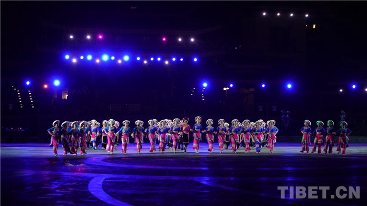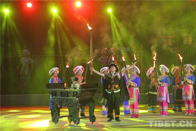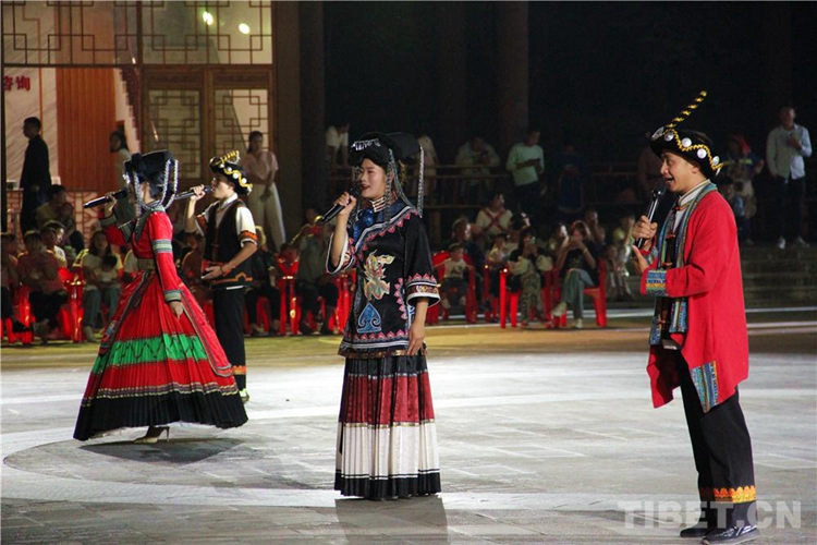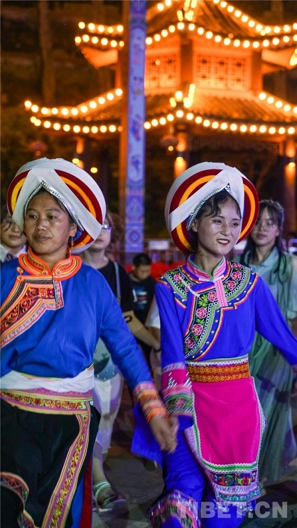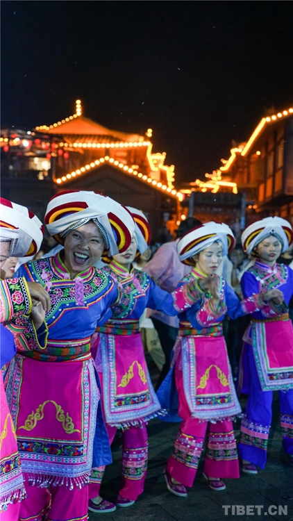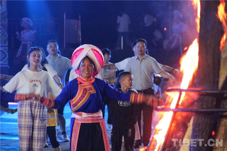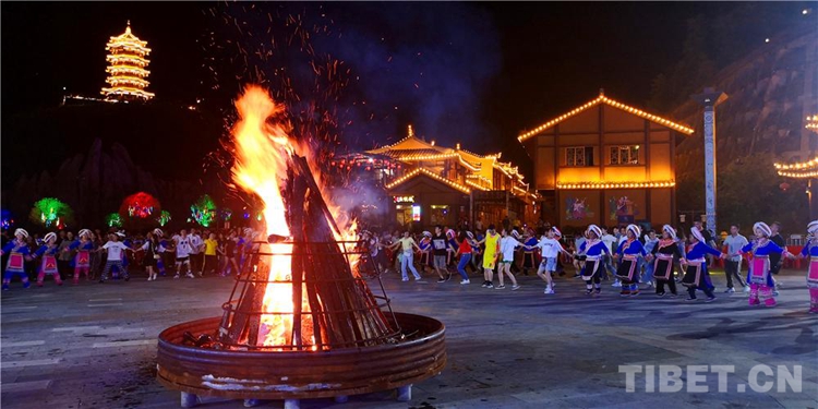中國西藏網(wǎng)訊 當(dāng)陣陣涼風(fēng)襲來,暑氣漸消,暮靄沉沉。碧水青山環(huán)抱的阿妹戚托小鎮(zhèn)卻漸漸躁動起來,熱騰的火苗將夏夜“點燃”,人們環(huán)繞火把載歌載舞、歡唱高歌,沉醉其中、樂而忘返。