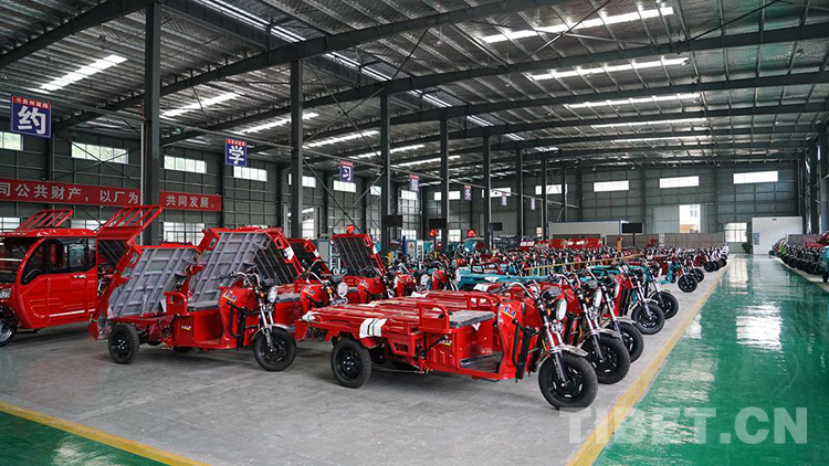 圖為生產(chǎn)線兩旁嶄新的電動三輪車 攝影:呂靜