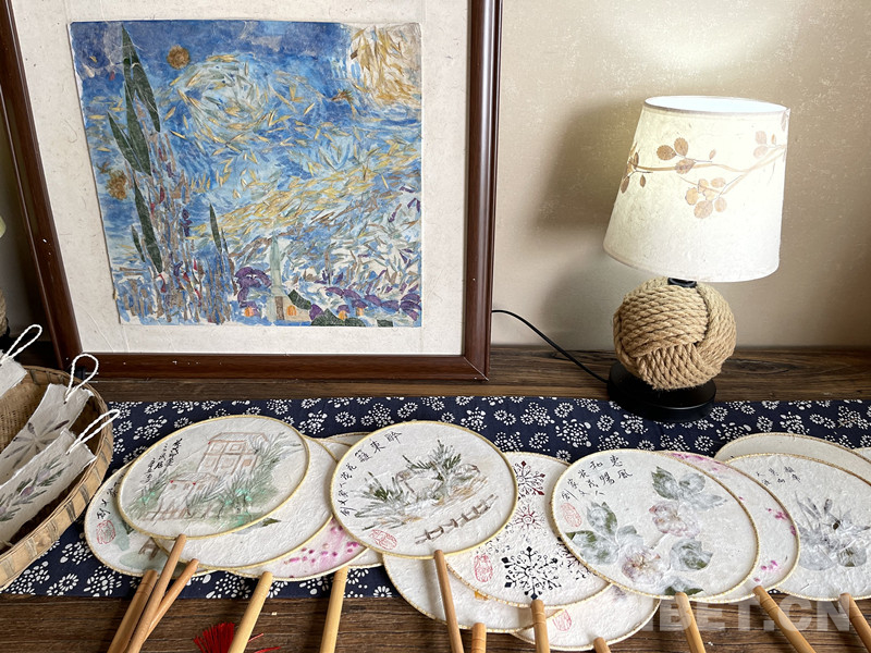 圖為扇子、臺(tái)燈等各式古法紙文創(chuàng)產(chǎn)品
