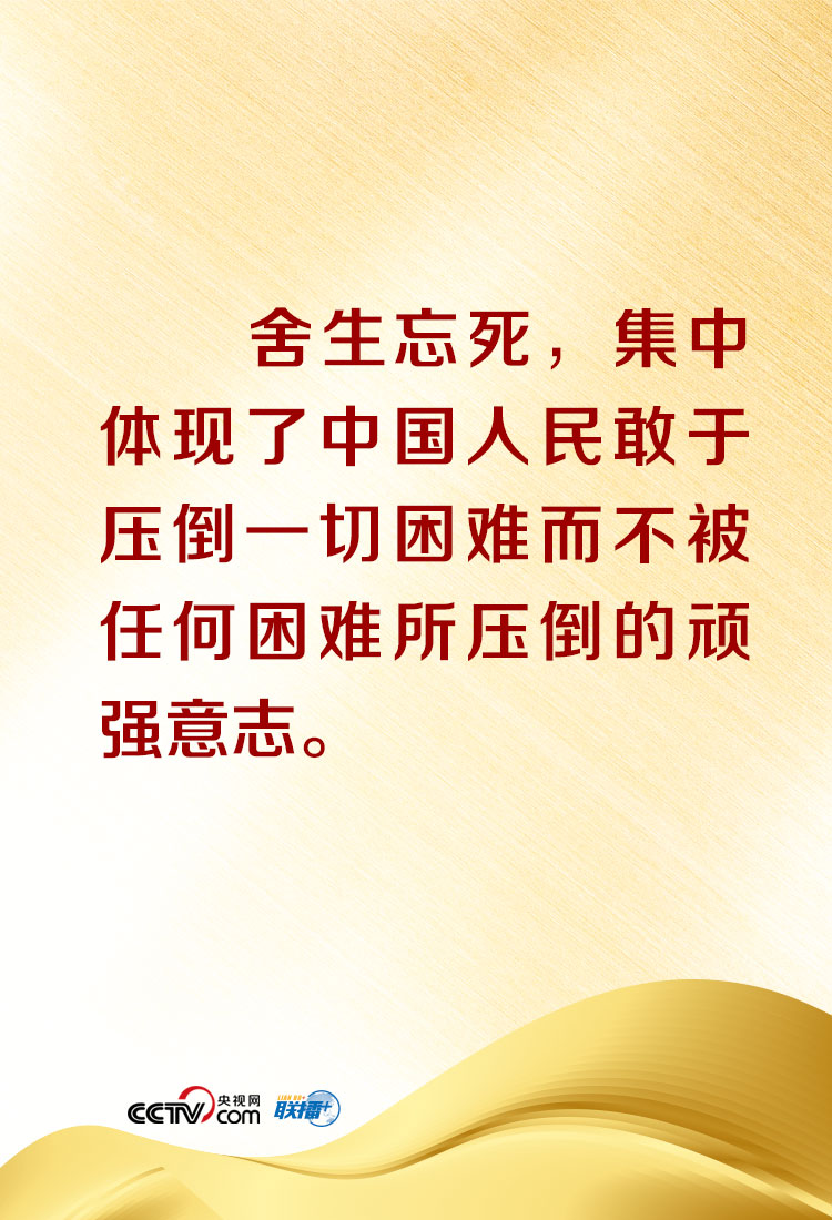 “在這場同嚴重疫情的殊死較量中,中國人民和中華民族以敢于斗爭、敢于勝利的大無畏氣概,鑄就了生命至上、舉國同心、舍生忘死、尊重科學、命運與共的偉大抗疫精神?!笨倳涍€在講話中特別概括、闡釋了偉大抗疫精神,并深刻指出,偉大抗疫精神,同中華民族長期形成的特質(zhì)稟賦和文化基因一脈相承,是愛國主義、集體主義、社會主義精神的傳承和發(fā)展,是中國精神的生動詮釋,豐富了民族精神和時代精神的內(nèi)涵。央視網(wǎng)《聯(lián)播+》欄目特對相關內(nèi)容進行梳理,與您共同在偉大精神中感受偉大的力量!