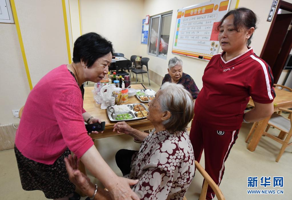 林丹(左一)在社區(qū)居家養(yǎng)老服務(wù)中心向徐佩英老人了解飲食健康情況(6月23日攝)。新華社記者 林善傳 攝