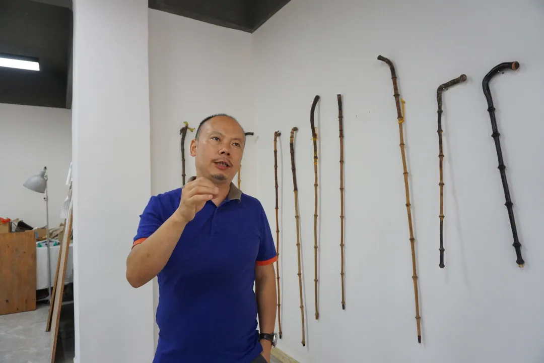 “我們考證了歷史文獻上的圖形,按照古人的圖譜,通過加熱來做出彎曲的造型?!壁w彌指向固定在墻上的筇竹杖,介紹“筇竹杖”背后蘊含的文化及它在今時今日的意義,他詳細描述了筇竹杖漫長的制作流程,在正式制作前,要收集生長6年左右的竹子放在通風陰涼的地方一年之久,來自然揮發(fā)掉內(nèi)部的水分糖分。