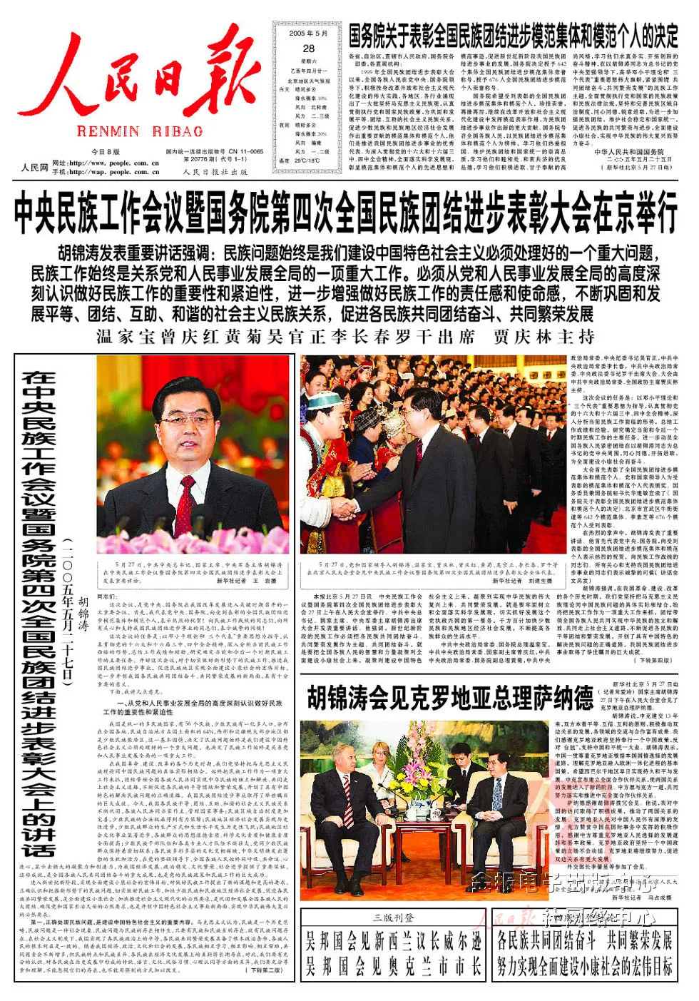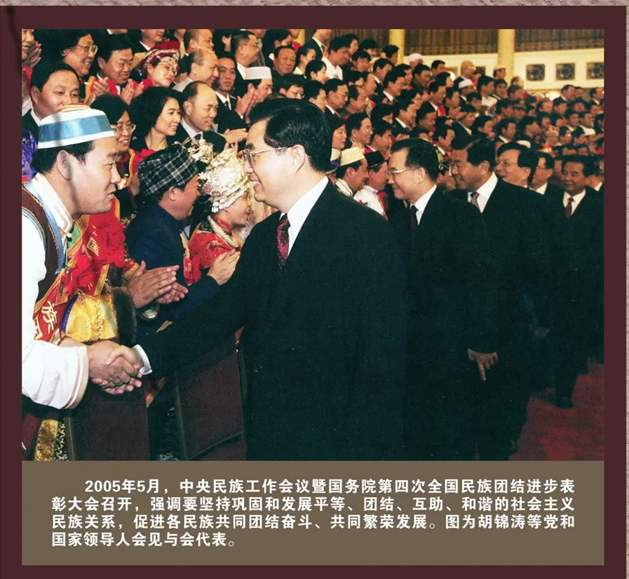 2005年5月27日至28日,第三次中央民族工作會議暨國務(wù)院第四次全國民族團結(jié)進步表彰大會在北京召開。