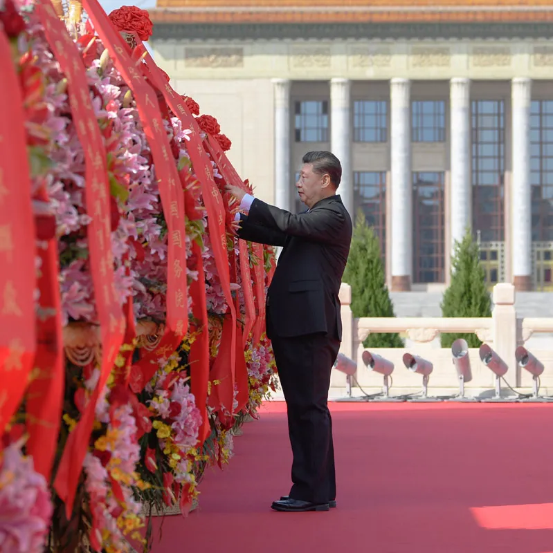 2020年9月30日上午,黨和國家領(lǐng)導(dǎo)人習(xí)近平、李克強、栗戰(zhàn)書、汪洋、王滬寧、趙樂際、韓正、王岐山等來到北京天安門廣場,出席烈士紀(jì)念日向人民英雄敬獻(xiàn)花籃儀式。這是習(xí)近平整理花籃上的緞帶。新華社記者 申宏 攝