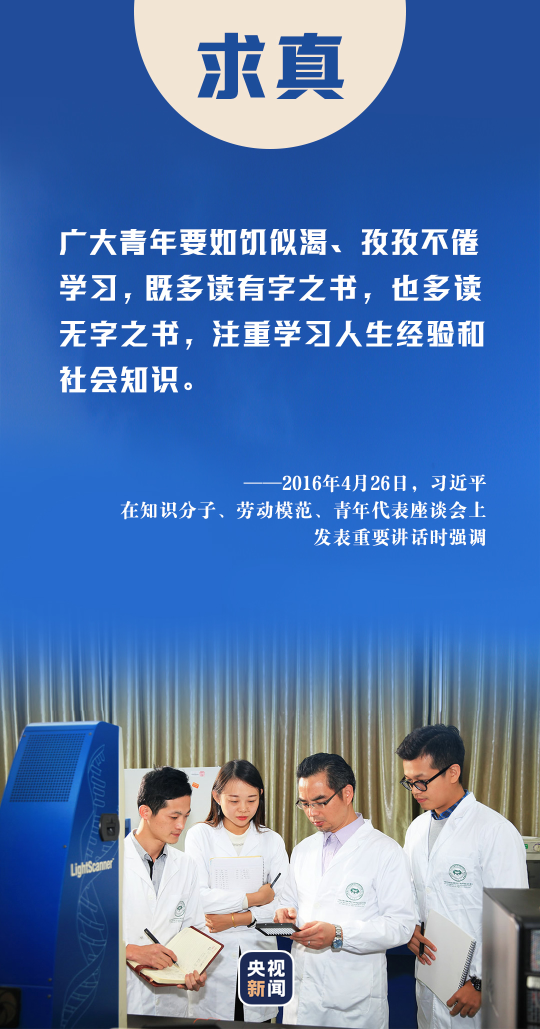 2013年五四青年節(jié),習近平總書記來到中國航天科技集團公司中國空間技術研究院,與青年代表座談??倳浿赋?,廣大青年要堅持面向現(xiàn)代化、面向世界、面向未來,增強知識更新的緊迫感,如饑似渴學習,既扎實打牢基礎知識又及時更新知識,既刻苦鉆研理論又積極掌握技能,不斷提高與時代發(fā)展和事業(yè)要求相適應的素質和能力。