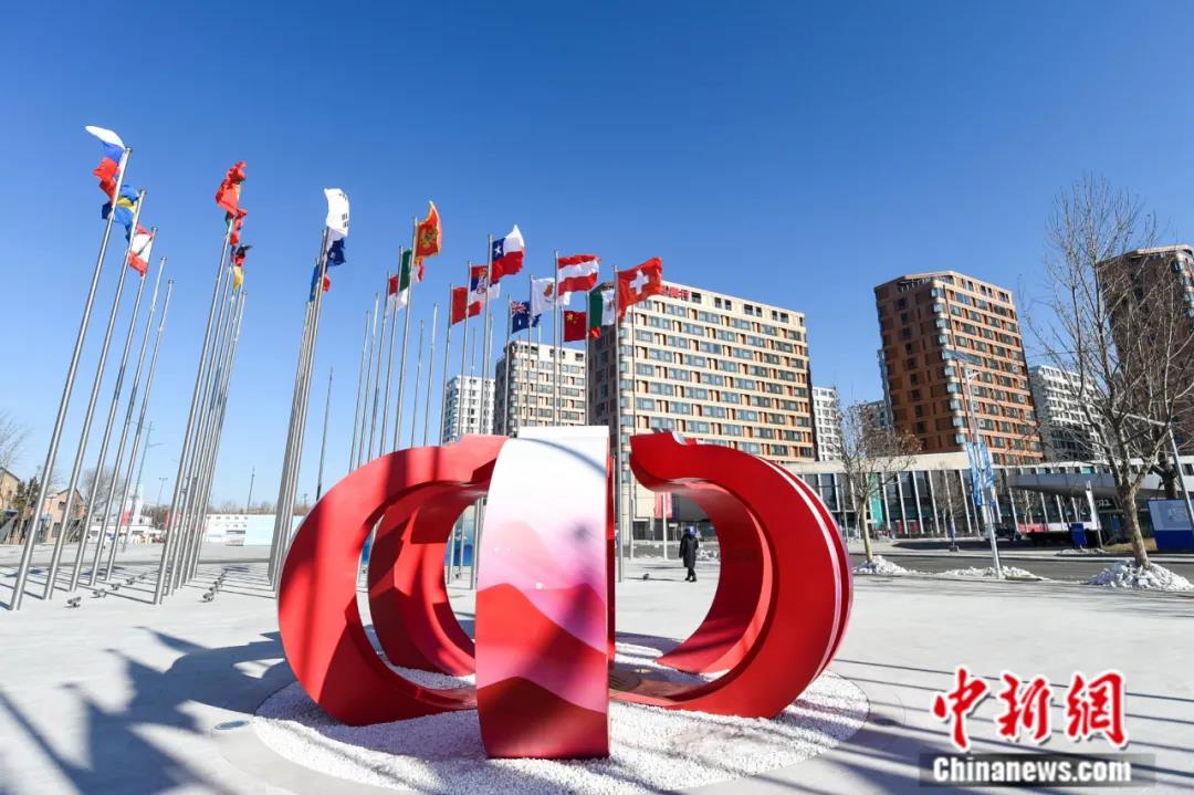 2022年1月27日,迎風(fēng)飄舞的各國旗幟將北京冬奧村點綴得韻味十足。北京冬奧會將于2022年2月4日開幕。中新社記者 何蓬磊 攝