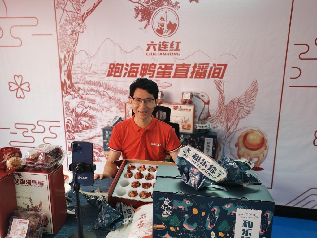 六連村食品廠負(fù)責(zé)人莫澤錦通過網(wǎng)絡(luò)直播銷售咸鴨蛋。 新華社記者趙葉蘋攝