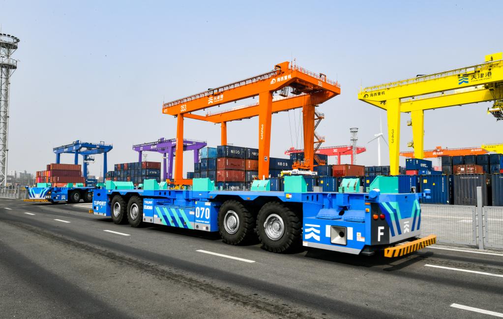 4月9日,在天津港北疆港區(qū)C段智能化集裝箱碼頭,智能水平運輸機器人在堆場內(nèi)行駛。新華社記者孫凡越攝