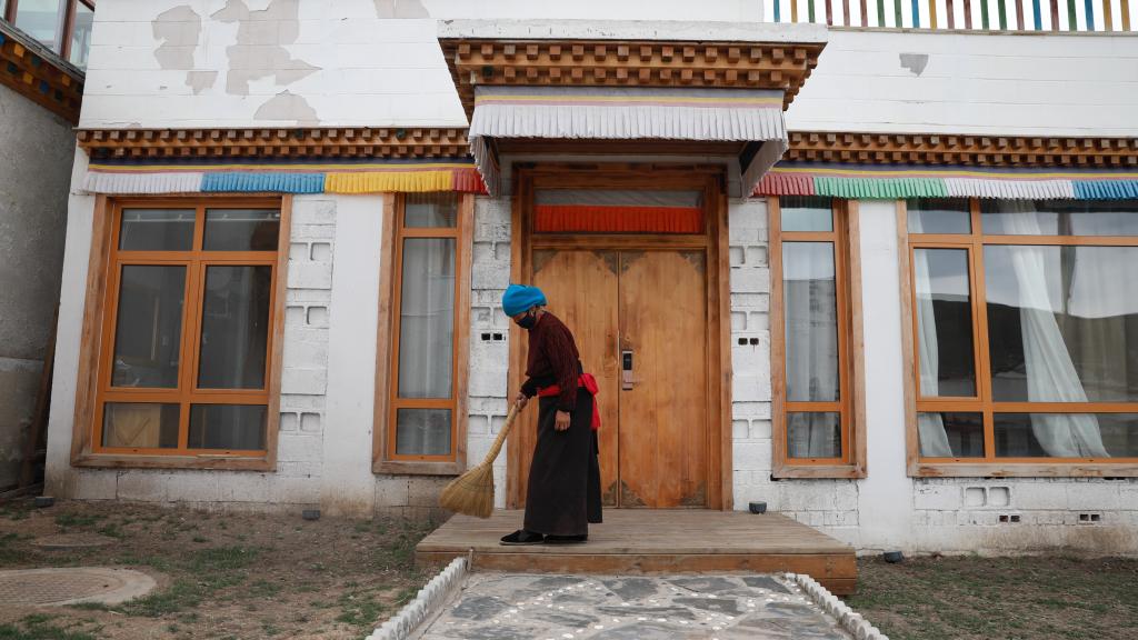 俄合拉村村民旦知草在自家的民宿前打掃衛(wèi)生。新華社記者 任延昕 攝