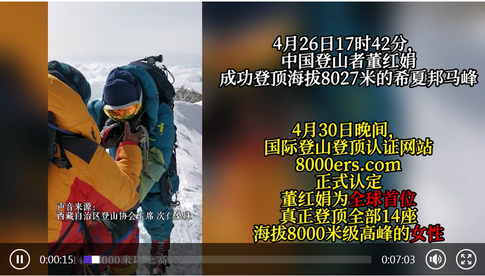 4月26日17時(shí)42分,中國(guó)登山者董紅娟成功登頂海拔8027米的希夏邦馬峰。30日晚間,國(guó)際登山登頂認(rèn)證網(wǎng)站8000ers.com正式認(rèn)定董紅娟為全球首位登頂全部14座海拔8000米級(jí)高峰的女性。