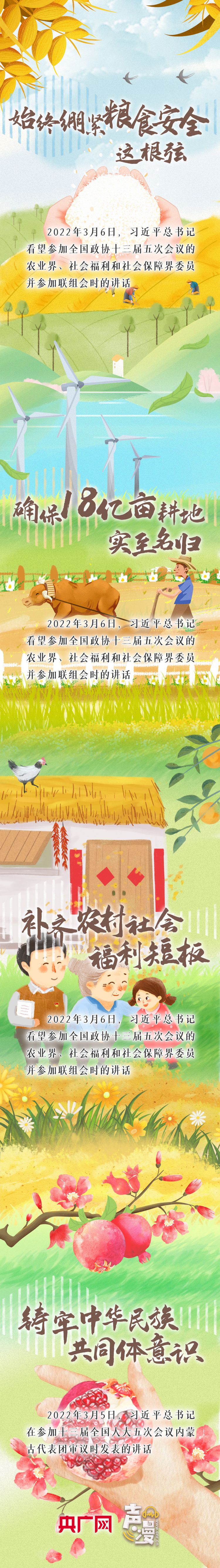 2022年全國(guó)兩會(huì)期間,習(xí)近平總書記多次“下團(tuán)組”,同代表委員們深入交流、共商國(guó)是,“始終繃緊糧食安全這根弦”“確保18億畝耕地實(shí)至名歸”“補(bǔ)齊農(nóng)村社會(huì)福利短板”“鑄牢中華民族共同體意識(shí)”……習(xí)近平總書記一系列重要講話,凝聚著人民的心聲,飽含著群眾的期盼,讓我們一起聆聽!