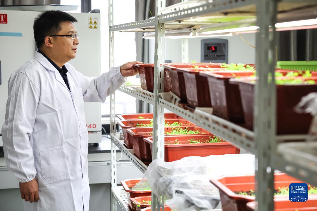 10月20日,貴州大學動物科學學院院長陳超在實驗室內觀察新品種牧草的生長情況。新華社記者 歐東衢 攝