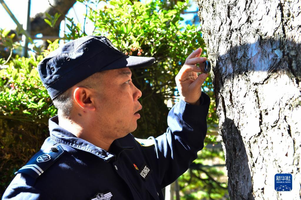 10月16日,安徽黃山守松人胡曉春用放大鏡檢查迎客松的樹皮和紋理。新華社發(fā)(蔡季安 攝)