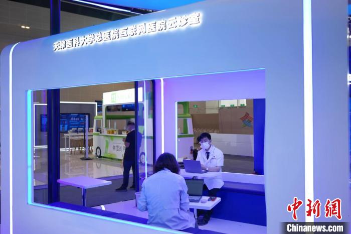 在天津醫(yī)科大學(xué)總醫(yī)院展廳,醫(yī)生在“云診室”通過(guò)互聯(lián)網(wǎng)醫(yī)院接診患者。記者了解到,在大會(huì)上,天津醫(yī)科大學(xué)總醫(yī)院宣布與科瑞泰醫(yī)療信息技術(shù)(天津)有限公司、360數(shù)字安全集團(tuán)天津公司、銳捷網(wǎng)絡(luò)股份有限公司、中國(guó)移動(dòng)通信集團(tuán)天津有限公司等開(kāi)展合作,共同開(kāi)啟互聯(lián)網(wǎng)醫(yī)院醫(yī)聯(lián)體“1236N”醫(yī)療健康服務(wù)新體系的建設(shè)之路。