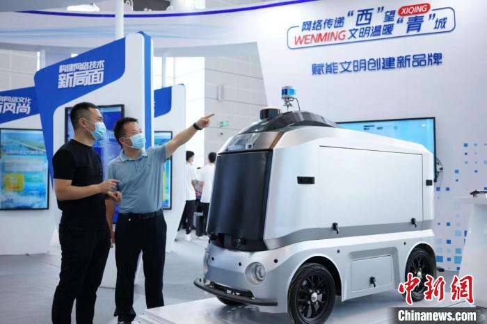 參觀者在天津西青展區(qū)參觀自動(dòng)駕駛安防巡邏車(chē)。 佟郁 攝