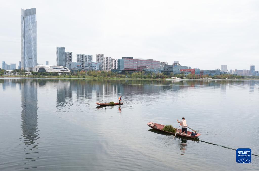 金秋時(shí)節(jié),四川天府新區(qū)興隆湖,4500余畝水面波光粼粼,湖水清澈見底,幾根水草隨波漂蕩。管護(hù)員賴小利站在小船上,熟練地伸出長桿網(wǎng)兜一撈一翻一抖,水草便被甩上船。