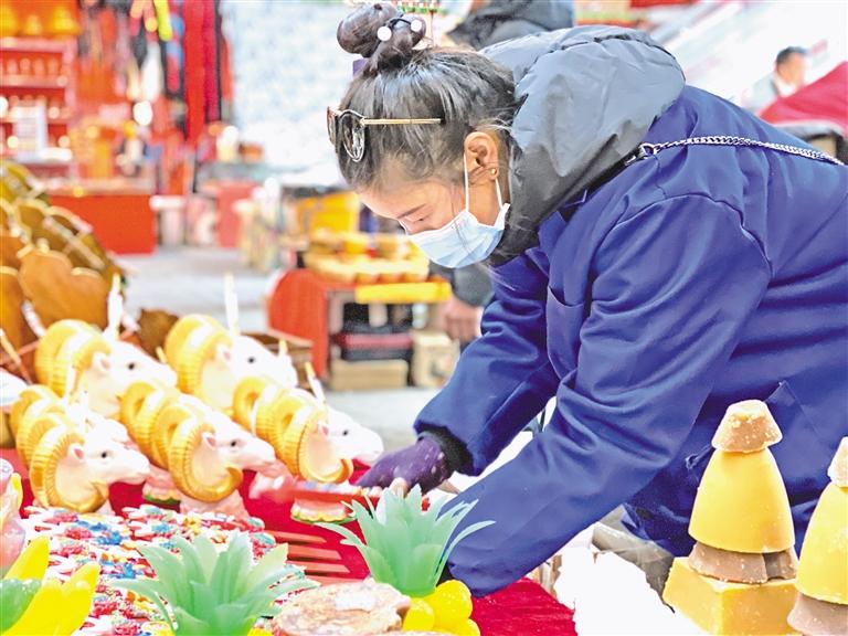 在雪域亙古浩瀚的歷史中,高原兒女自古以來便認(rèn)定“羊”是吉祥的動物,代表了藏族群眾祈盼來年五谷豐登、六畜興旺。塑彩羊頭在藏語中稱為“隆果”,一般擺放在新年布置的貢品中央?!鞍謰屓ツ曩徺I了一種用石灰制作的塑彩羊頭,今年我想購買陶瓷制作的塑彩羊頭放在爸媽家,去年買的拿回自己家,這樣既環(huán)保,也讓老人開心?!笔忻袼骼释言谀曦洈偽毁徺I“隆果”時說。