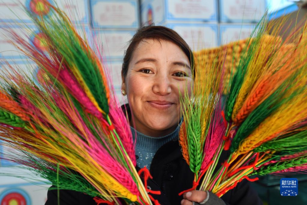 五彩麥穗藏語稱“羅薩美朵”?!傲_薩”是藏歷新年之意,“美朵”是鮮花之意?!傲_薩美朵”是經(jīng)過染色的麥穗花卉?!扒鞋敽小崩锉夭宓摹傲_薩美朵”寓意著來年有一個美滿、豐收的幸福年。來自堆龍德慶區(qū)的次卓瑪每年都會在藏歷4月15日之前開始播種,藏歷6月施肥澆水,等到藏歷8月開始收割。收割后的麥穗會經(jīng)過1個月時間的晾曬,再進行封存,等到藏歷12月開始染色,再次晾曬封存。